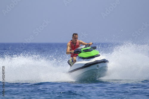 Tourists enjoy driving jetski on the ocean
