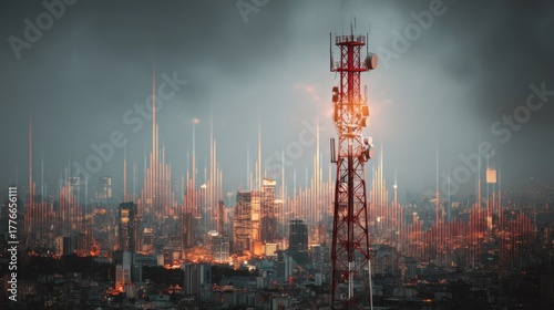 Tower with Lights Against City Skyline and Dramatic Sky in Evening with Urban Landscape and Urban Infrastructure in Background
