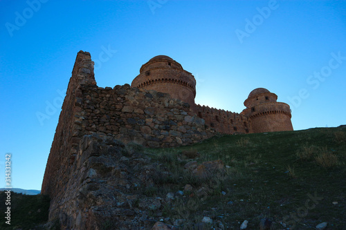 towers of the medieval spanish castle La Calahorra behind the outer wall in the light of the evening sun, Granada, Spain