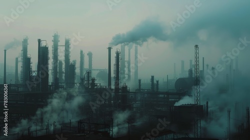 Toxic smog drifting through an industrial park, blurring lines between machines and nature