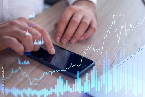 Trader holding in the hands a smart phone and researching stock market to proceed right investment solutions. Internet trading and wealth management concept. Hologram Forex chart over close up shot.