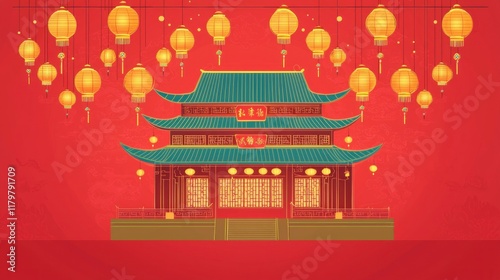 Traditional Asian Temple Surrounded by Glowing Lanterns on a Vibrant Red Background, Perfect for Celebrating Festivals and Cultural Events