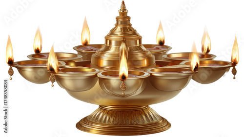 Traditional brass oil lamp with multiple burning flames used for Hindu religious rituals and festive celebrations isolated on white background
