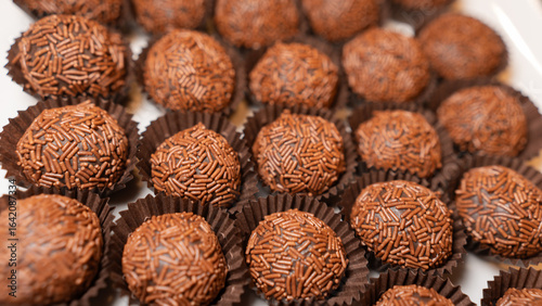 Traditional Brazilian brigadeiro chocolate truffles in elegant presentation. Perfect for dessert tables, party favors, and gourmet food photography with rich cocoa flavor