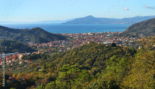 Traditional buildings, mountain houses by sea. Nature and architecture of Liguria. Blue skies, clouds, backdrop for design.