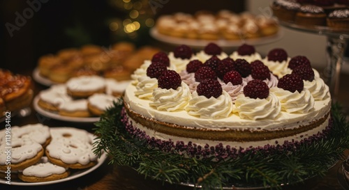 Traditional Christmas cake with fruits and nuts on a light table and light background. Dessert for the winter holidays. Christmas decorations and lights