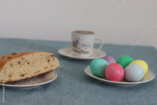 Traditional Czech Easter cake served with a cup of coffee and decorated Easter eggs. Authentic festive table setting ideal for spring holiday, bakery, and cultural celebration themes.