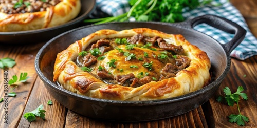 Traditional German dish of a savory meat-filled pastry served in a hot pan with caramelized onions and melted cheese, garnished with fresh parsley , recipe, meal