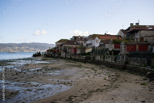 Traditional granaries and houses line the coast of combarro, a charming fishing village in galicia, spain, on a cloudy day, with the tide out and the beach exposed