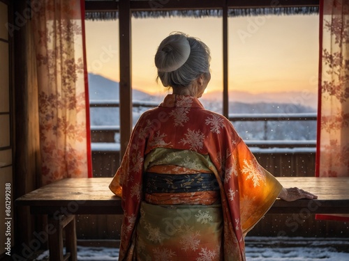 Traditional hairstyle adorns elderly woman standing by wooden table, gazing out of open window at sunset. An ornate kimono with intricate patterns, wide obi belt worn.