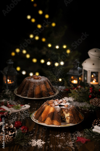 Traditional homemade chocolate christmas cake with orange candied fruits powdering with icing sugar. Lignts bokeh background
