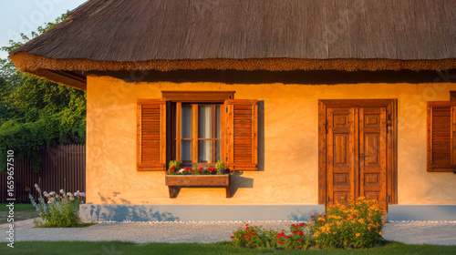 Traditional house exterior with thatched roof and wooden details amidst blooming flowers