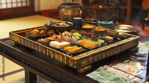 Traditional Japanese Cuisine Platter with Variety of Dishes
