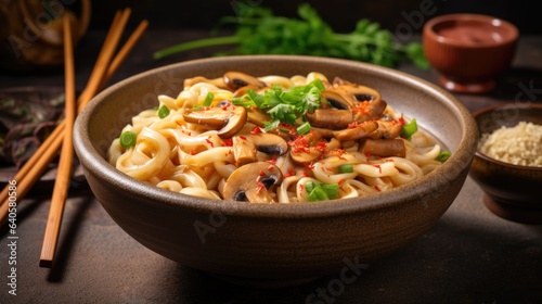 Traditional Japanese udon noodles with mushrooms, close-up on a stone background