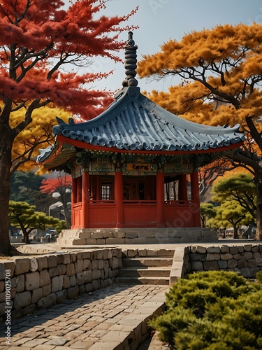Traditional Korean pagoda against a bold artistic backdrop.