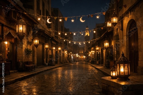 Traditional lanterns and crescent moon decorations glowing on empty street during Ramadan evening