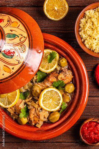 Traditional moroccan tajine of chicken with salted lemons, olives