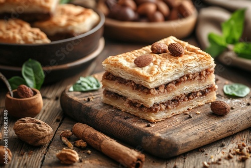 Traditional nut and cinnamon layered pastries stacked on a wooden board in a rustic setting with warm lighting showcasing flaky crispy textures and sweet caramelized flavor