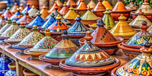 Traditional Tajines on display in a vibrant market setting , Marrakesh, Morocco, colorful, exotic, souk, North Africa