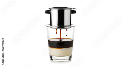 Traditional Vietnamese hot drip coffee with stainless steel phin filter placed on top of a clear glass, showing layers of dark coffee and condensed milk, isolated on white background, high quality stu