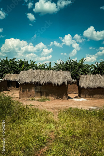 Traditional village homes surrounded by banana trees in Angola under a bright blue sky with scattered clouds