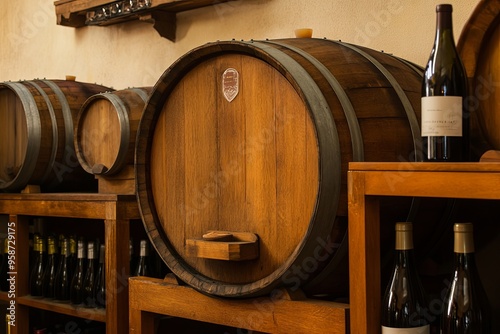 Traditional wooden wine barrels and bottles displayed prominently in a rustic winery setting during daylight hours