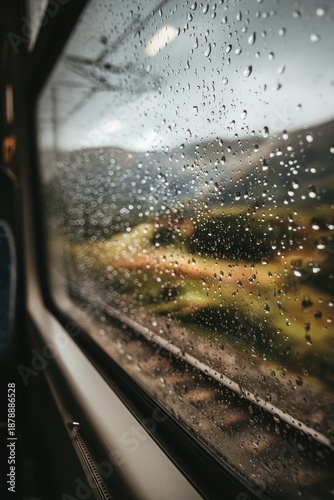 Train journey through a rainy landscape with water droplets on the window in the countryside