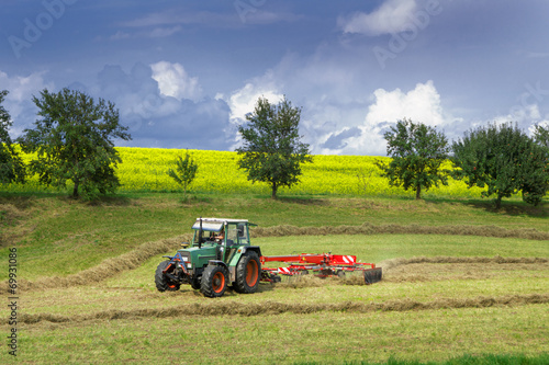 Traktor mit Heuwender vor einem Rapsfeld