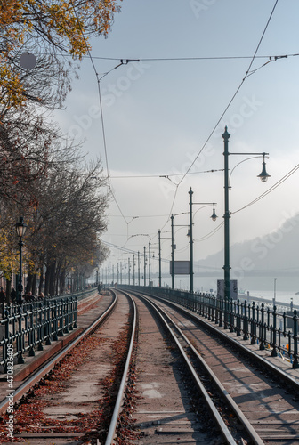 Tram rails in Budapest, beautiful autumn cityscape
