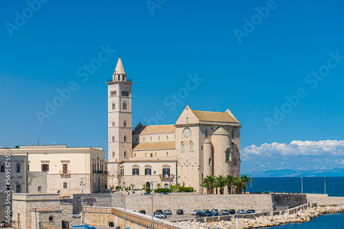 Trani Cathedral (Basilica di San Nicola Pellegrino) and medieval waterfront panoramic view from the sea — Romanesque architecture on the Adriatic coast, Puglia, southern Italy.