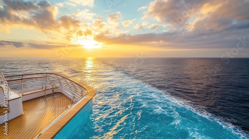 Tranquil adult pool area on a cruise ship, with glistening ocean views and warm sunlight casting a golden glow over the serene scene.