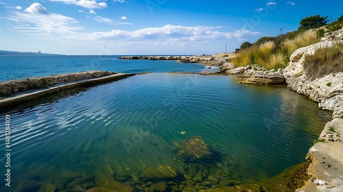 Tranquil Coastal Pool Filled With Clear Turquoise Water Under Blue Sky
