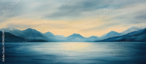 Tranquil evening seascape with mountain silhouettes and soft reflections on calm water under a serene sky in muted hues