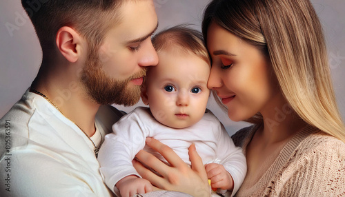 Tranquil Family Portrait: Parents with Their Happy and Peaceful Baby