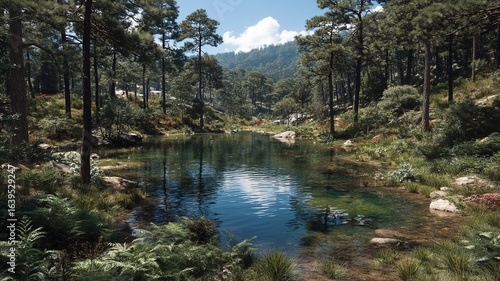 Tranquil forest pond with clear water reflecting blue sky and surrounding evergreen trees