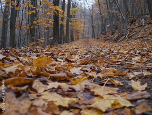 Tranquil Forest Trail Blanketed in Vibrant Autumn Leaves - Serene Nature Scene in Fall Season