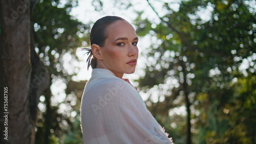Tranquil girl enjoy nature at sunny weekend in forest closeup. Woman at sunlight