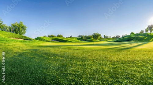 Tranquil golf course. Panoramic view of elegant sport amid lush greenery under blue sky.