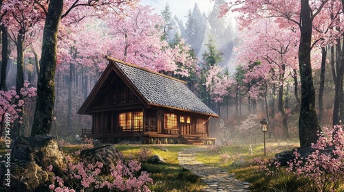 Tranquil Japanese Cottage Surrounded by Cherry Blossom Trees