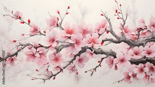 Tranquil Japanese Ink Painting of Delicate Cherry Blossoms in Spring Soft Elegant and Serene Floral Landscape in Traditional Oriental Art Style