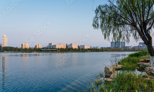 Tranquil Lakeside View Surrounded by Modern Architecture and Nature