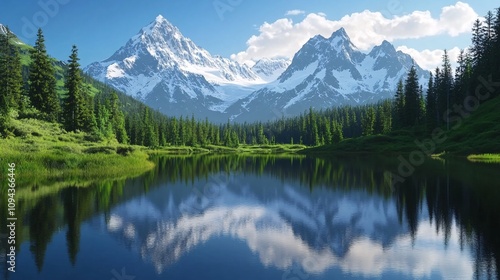 Tranquil Mountain Landscape with Snow-Capped Peaks and Calm Lake Reflection in 3D Render - Simple, Clean Design