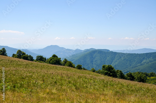 Tranquil mountain scene featuring rolling green hills under a bright, clear sky with sunlight. Ideal representation of serenity and harmony in natural surroundings. Carpathian Mountains, Ukraine