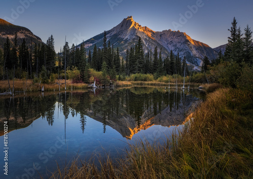 Tranquil pond reflecting rugged mountain peak at sunset
