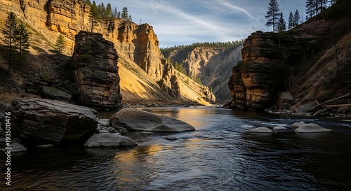 Tranquil river flowing through a rugged canyon at sunset