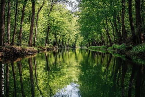 Tranquil River Reflecting Lush Green Trees in a Forest