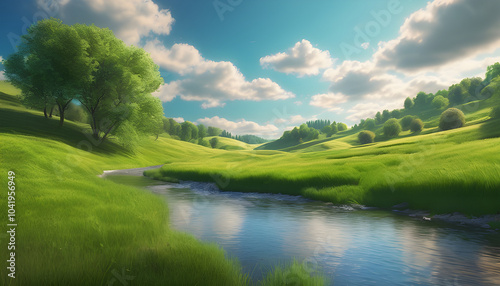 Tranquil River Winding Through Green Fields And Blue Skies