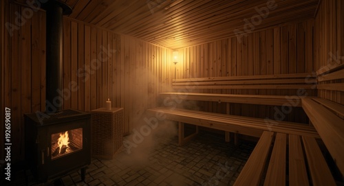 Tranquil sauna retreat with rustic stove, benches, and atmospheric steam elements