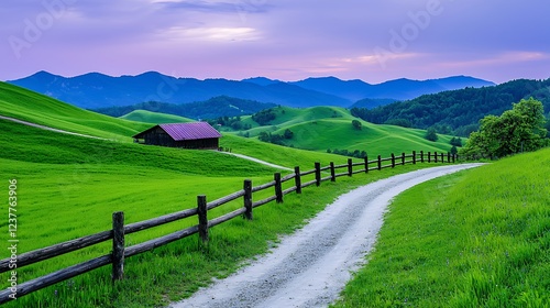Tranquil Scenic Landscape with Rolling Green Hills and Barn