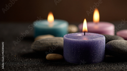 Tranquil Spa Setting: Scented Candle Arrangement with Zen Stones and Natural Elements for Wellness and Relaxation